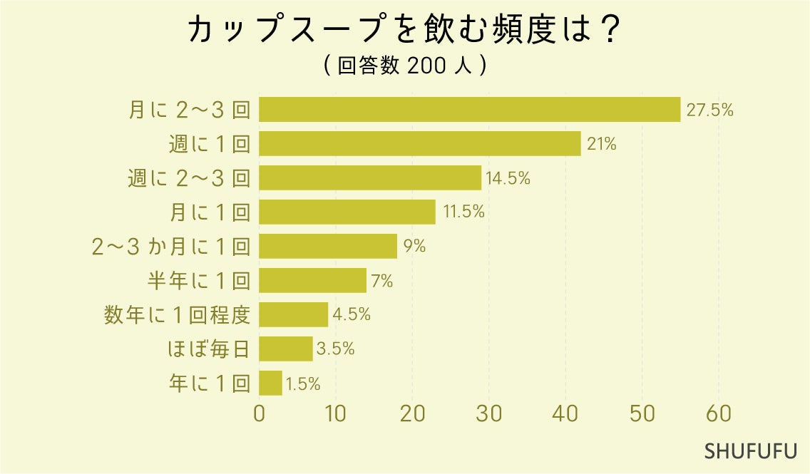 男女200人に「好きなクノールカップスープ」に関するアンケート調査を行った所、カップスープを飲む頻度は「月に2~3回」が一番多かったです。