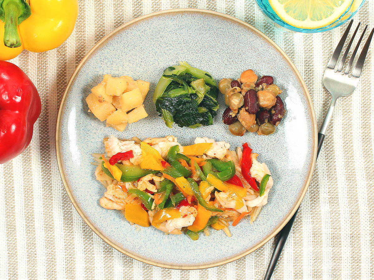 蒸し鶏ささみのうえに、鮮やかな三色ピーマンと人参をトッピングしました。唐辛子の辛味と花椒の痺れが絶妙に調和したソースで仕上げています。