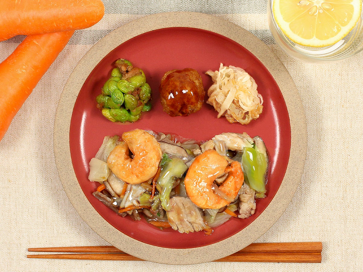 ぷりっとした海老と、豚肉、5種類の野菜を使用した八宝菜です。餡は鶏ガラをベースに、具材の旨みが溶け込んだ優しい味わいに仕上げております。