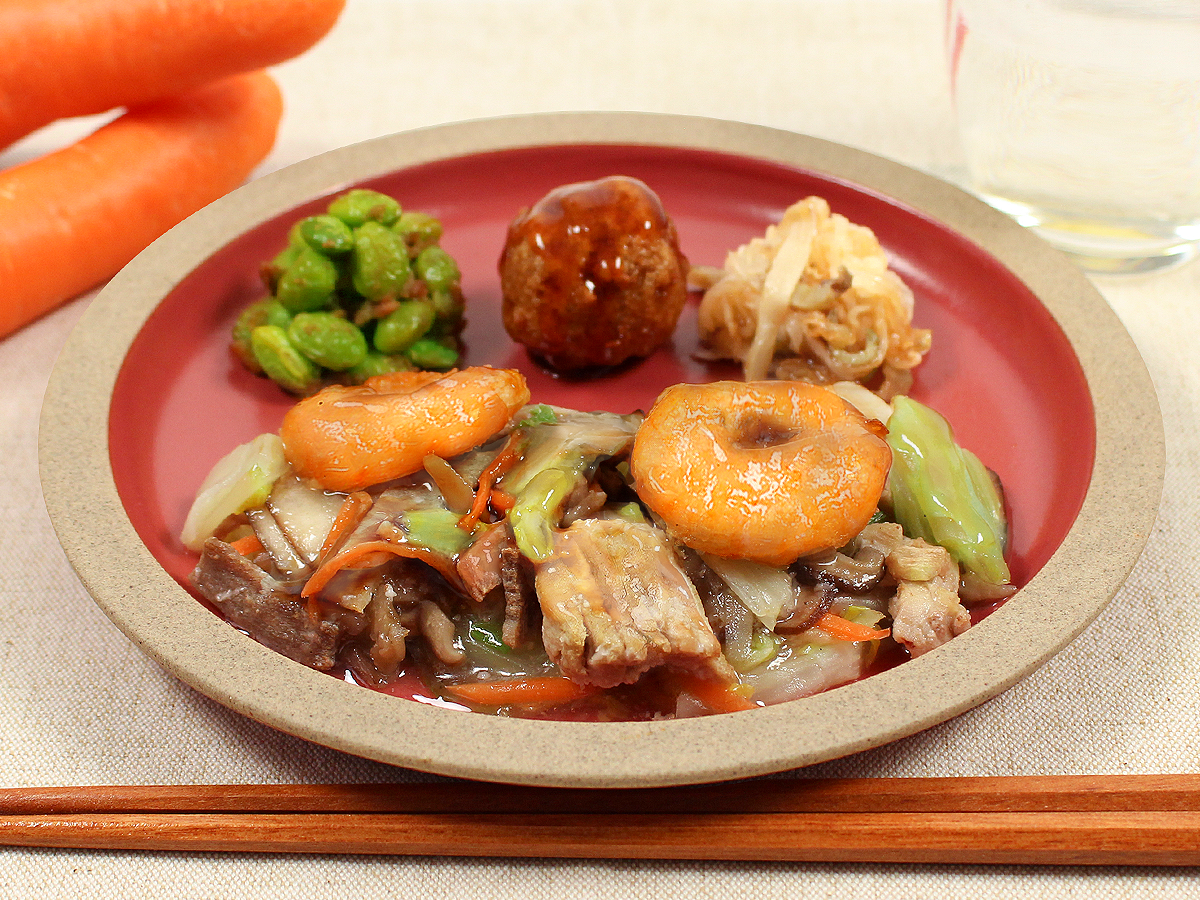 ぷりっとした海老と、豚肉、5種類の野菜を使用した八宝菜です。餡は鶏ガラをベースに、具材の旨みが溶け込んだ優しい味わいに仕上げております。