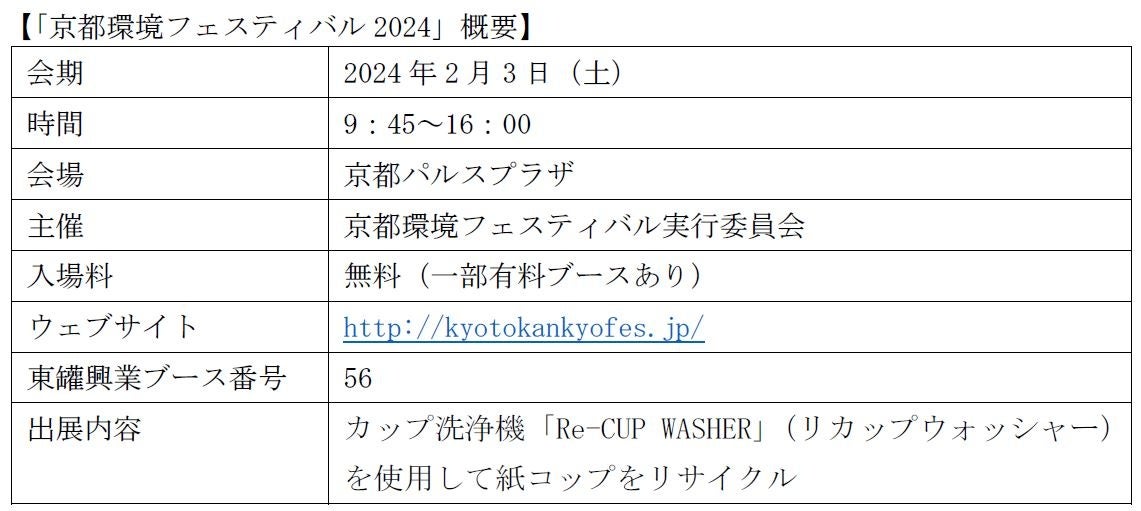 東罐興業は、環境先進地である京都で開催される本フェスティバルにおいて、「Re-CUP WASHER」による使用済み紙コップの分別回収活動のほか、パネル展示を通じて使用済み紙コップのリサイクルについて啓発活動を行います。