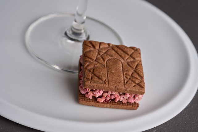 移したガナッシュとフランボワーズジャムを、アトリエ パージュのロゴをかたどったクッキーで挟んだクッキー