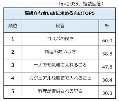 ■高級立ち食い店に求めるのは「コスパの良さ」「料理のおいしさ」