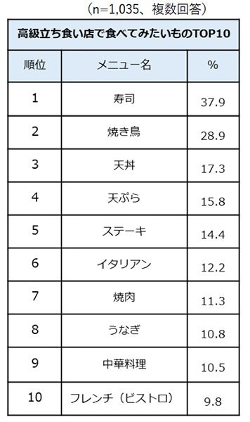 ■「高級立ち食い店で食べてみたいもの」上位には寿司、焼き鳥、天丼がランクイン