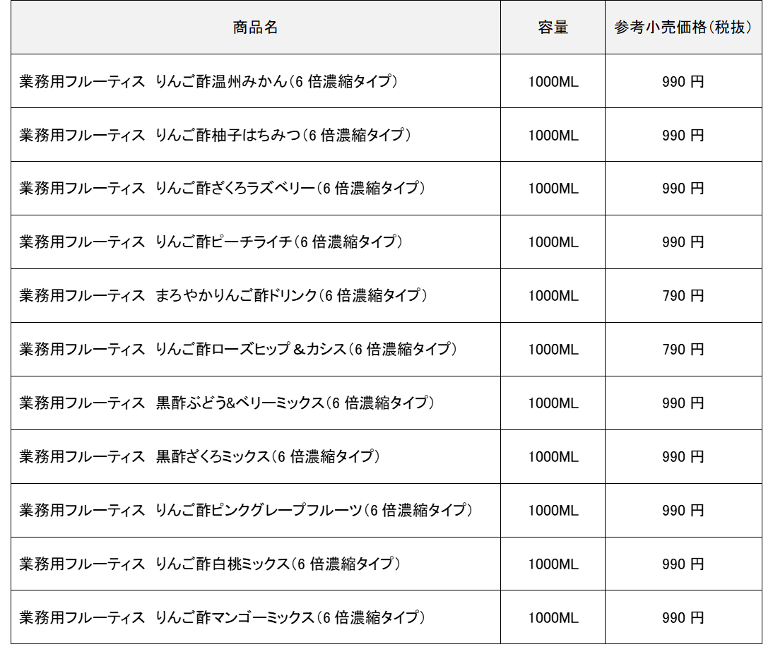 株式会社Mizkan (本社:愛知県半田市、代表取締役社長兼CEO:吉永 智征、以下:ミツカン)は2月14日(水)より「業務用フルーティス りんご酢温州みかん(6倍濃縮タイプ)」「業務用フルーティス りんご酢柚子はちみつ(6倍濃縮タイプ)」の2品を発売し、3月14日(木)に「業務用フルーティス まろやかりんご酢ドリンク(6倍濃縮タイプ)」を含め9品、合わせてシリーズ計11品を発売いたします。