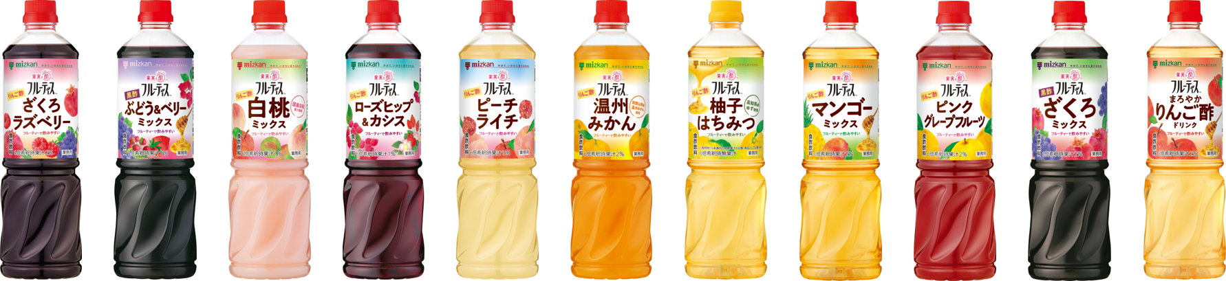 果汁とお酢を合わせて仕上げたミツカン業務用フルーティスシリーズは全11品。おいしさや彩りなど、お客様のニーズに合わせて、選ぶことができます。