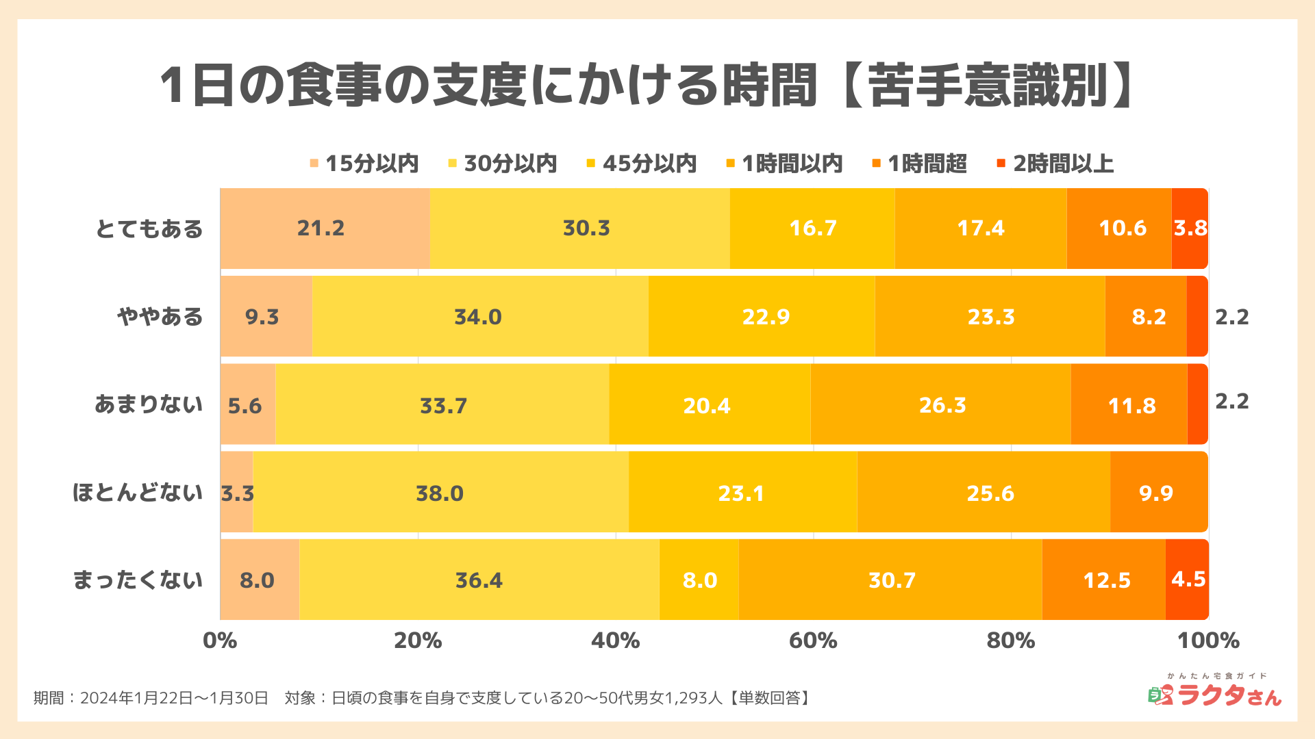 1日あたりの食事の支度にかけている時間を聞いてみると、最も多いのは「30分以内(29.3%)」、次いで「1時間以内(20.5%)」、「45分以内(17.4%)」でした。
