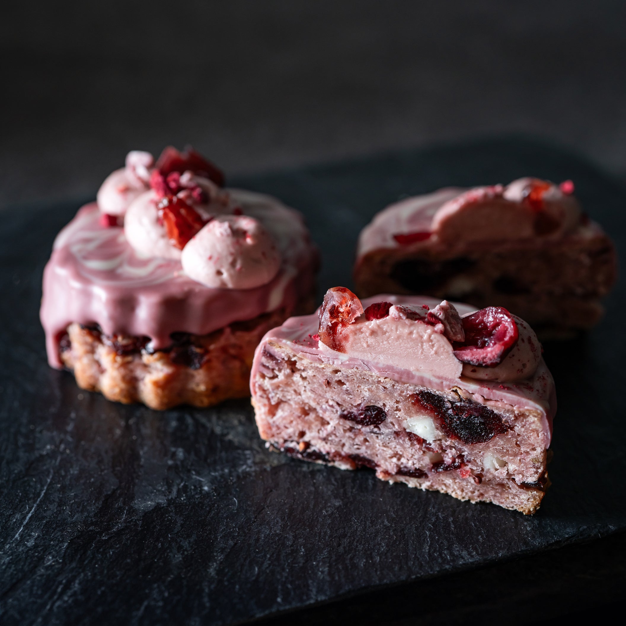 自家製クランベリーソースを練り込んだ生地に、たっぷりのドライクランベリーとホワイトチョコチップが入った、甘酸っぱくフルーティーなスコーンです。ルビーチョコレートでマーブル模様にコーティングし、ルビーチョコクリームとドライクランベリーなどで可愛らしく仕上げました。