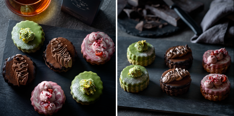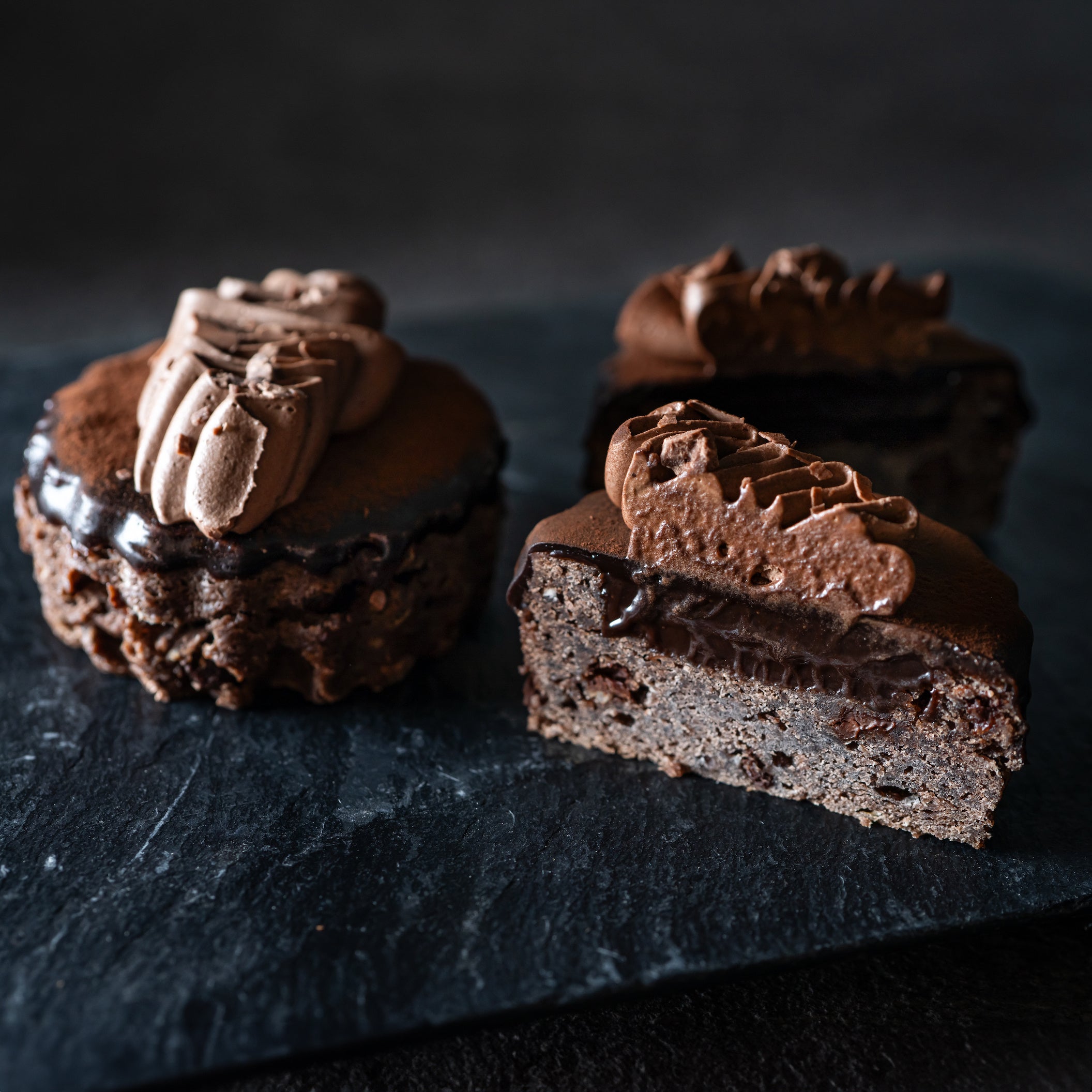 ビターなココア生地にたっぷりとチョコチップを練り込み、中心には生チョコレートを詰め込みました。 濃厚なチョコレートグラサージュとクリームでデコレーションし、とろける甘さにカカオの香りが広がります。