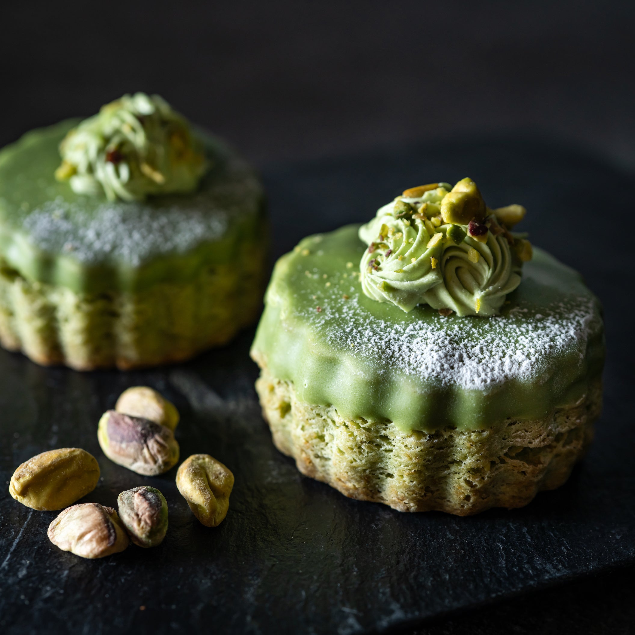 ピスタチオのナッツが香るスコーン生地に、ピスタチオペーストを練り込んだチョコレートと濃厚でコクのあるピスタチオクリームをトッピングしています。ナッツの軽快な食感と香ばしさにチョコレートの甘さがよく合い、ピスタチオグリーンが鮮やかに映えます。