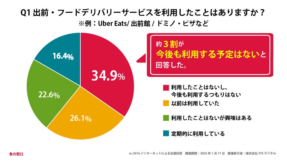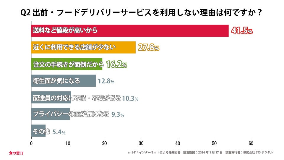 そこで、株式会社STSデジタルと一般社団法人 日本唐揚協会が共同運営している食の窓口(URL:https://karaage.ne.jp/contents/ )は、20歳〜60歳以上の男女2,414人を対象に「出前・デリバリーサービスに関するアンケート調査」を実施しました。