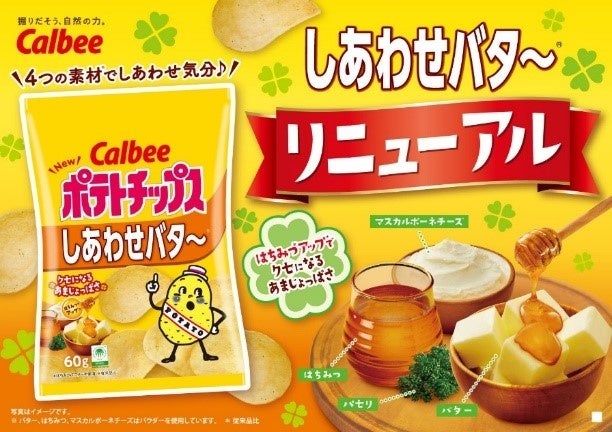 『ポテトチップス しあわせバタ~』は「バター」「はちみつ」「パセリ」「マスカルポーネチーズ」の4つの素材※2をベースにほんのりあまじょっぱいおいしさが楽しめるポテトチップスです。2010年に初めてコンビニエンスストアで期間限定発売して以来、お客様から大変ご好評をいただき、2015年からは全国で通年販売しております。現在では、カルビーポテトチップスシリーズの中で「うすしお味」、「コンソメパンチ」、「のりしお」に次ぐ、人気フレーバーです。