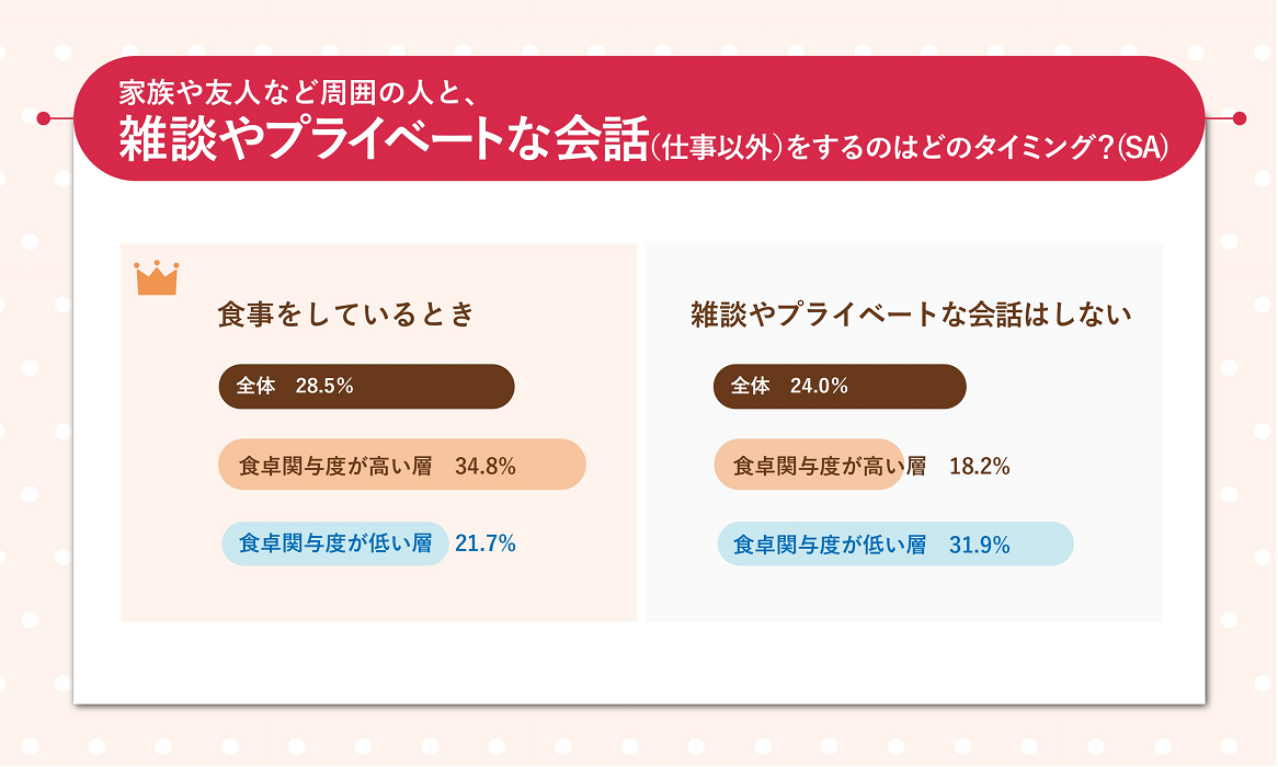 家族や友人など周囲の人と、雑談やプライベートな会話(仕事以外)をするのはどのタイミングか調査したところ、1位は「食事をしているとき(28.5%)」となり、2位は「雑談やプライベートな会話はしない(24.0%)」、3位は「休憩をしているとき(23.5%)」という結果になりました。食事を共にする(共食)のは、雑談やプライベートな会話をする最も重要な場だということがわかりました。積極的に食事を共にする(共食)時間を取ることで、コミュニケーションを目的とした時間を取りづらい現代人にも、コミュニケーションの機会が増えていくと考えます。