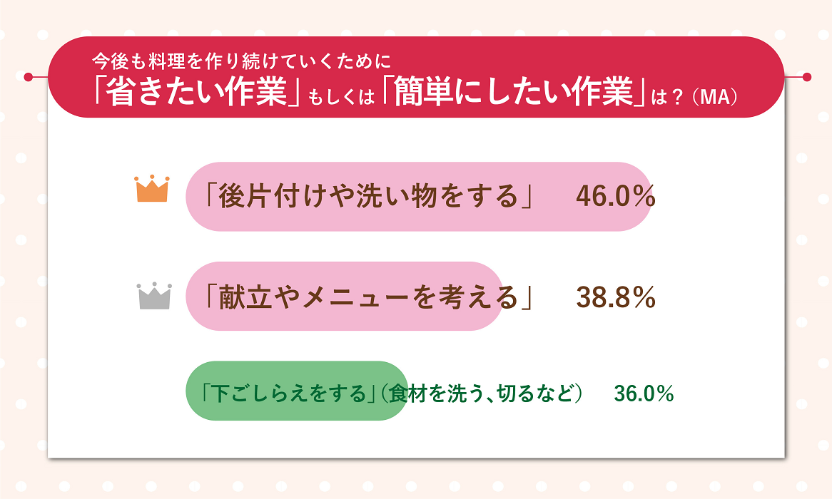 「献立を考える」「後片付け」は、「調理する」ことよりも負担になっていることが明らかに