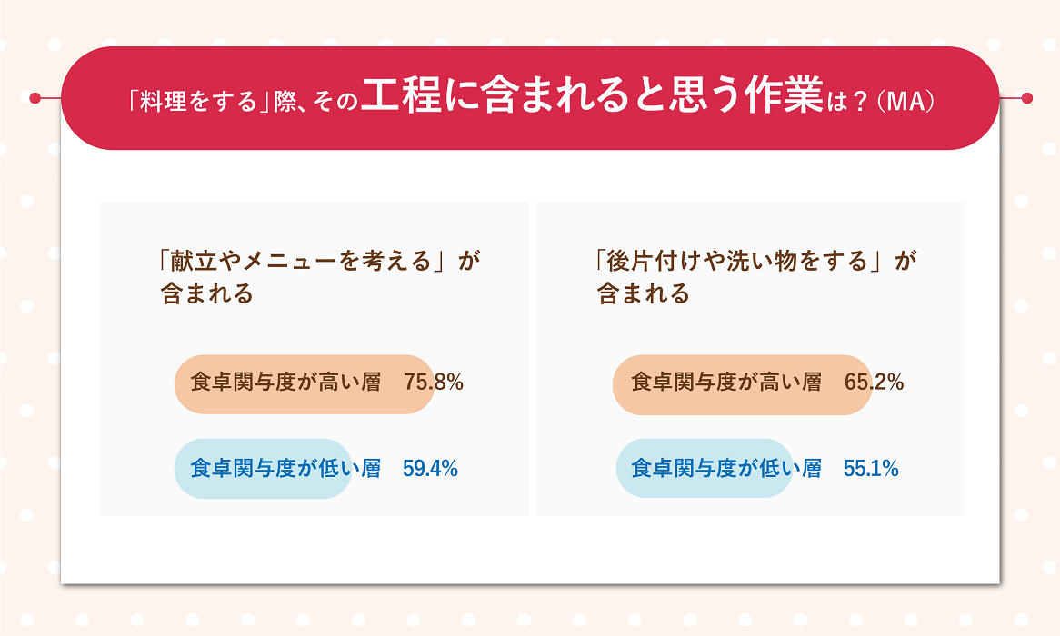 そのほかに、「後片付けや洗い物をする」は含まれると回答した割合は、食卓関与度が高い層は65.2%、低い層は55.1%となり、食卓関与度は、料理工程に対する意識についても影響していることがわかる結果となりました。