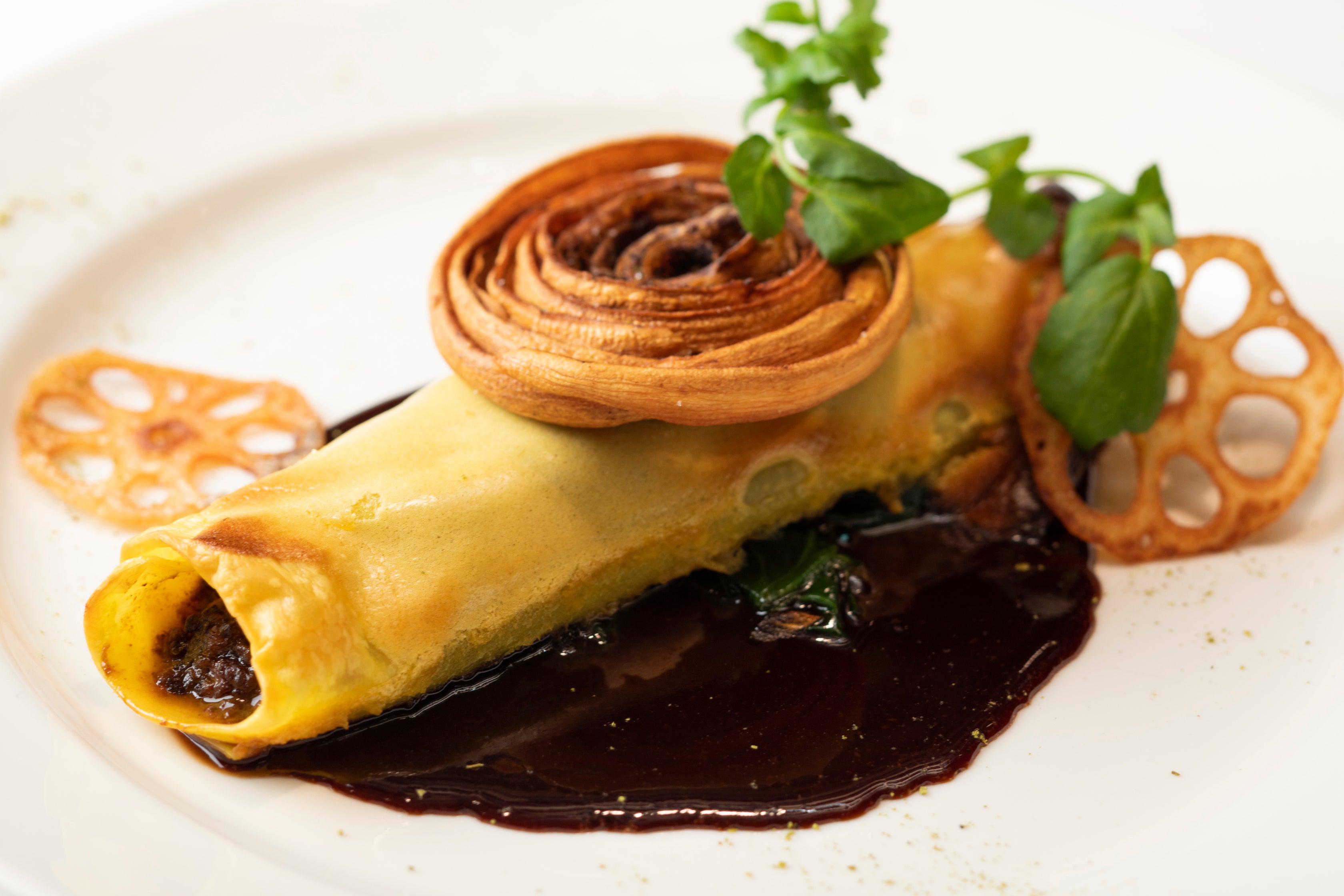 千葉県の根菜とイノシシのカネロニ仕立て 味噌風味の赤ワインソース