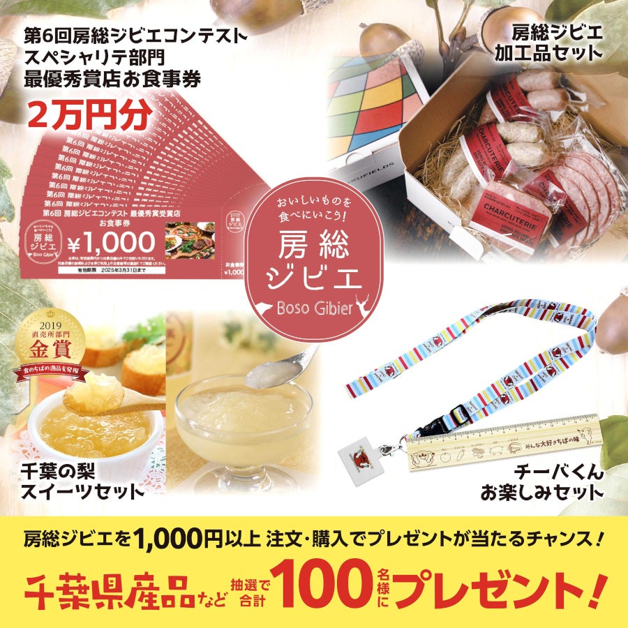 参加店舗で対象の房総ジビエ料理や商品を 1,000円以上注文・購入し、応募された方の中から、抽選で100名様に県産品等をプレゼントします。