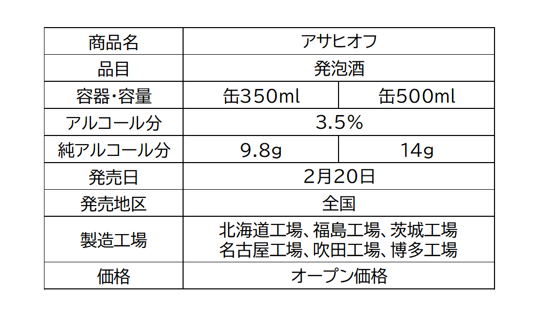 アサヒビール株式会社(本社 東京、社長 松山一雄)は、『アサヒオフ』の中味とパッケージデザインを刷新し、発泡酒として、2月20日から発売します。今回のクオリティアップに伴う処方の見直しで、新ジャンルから発泡酒へ変更となります。