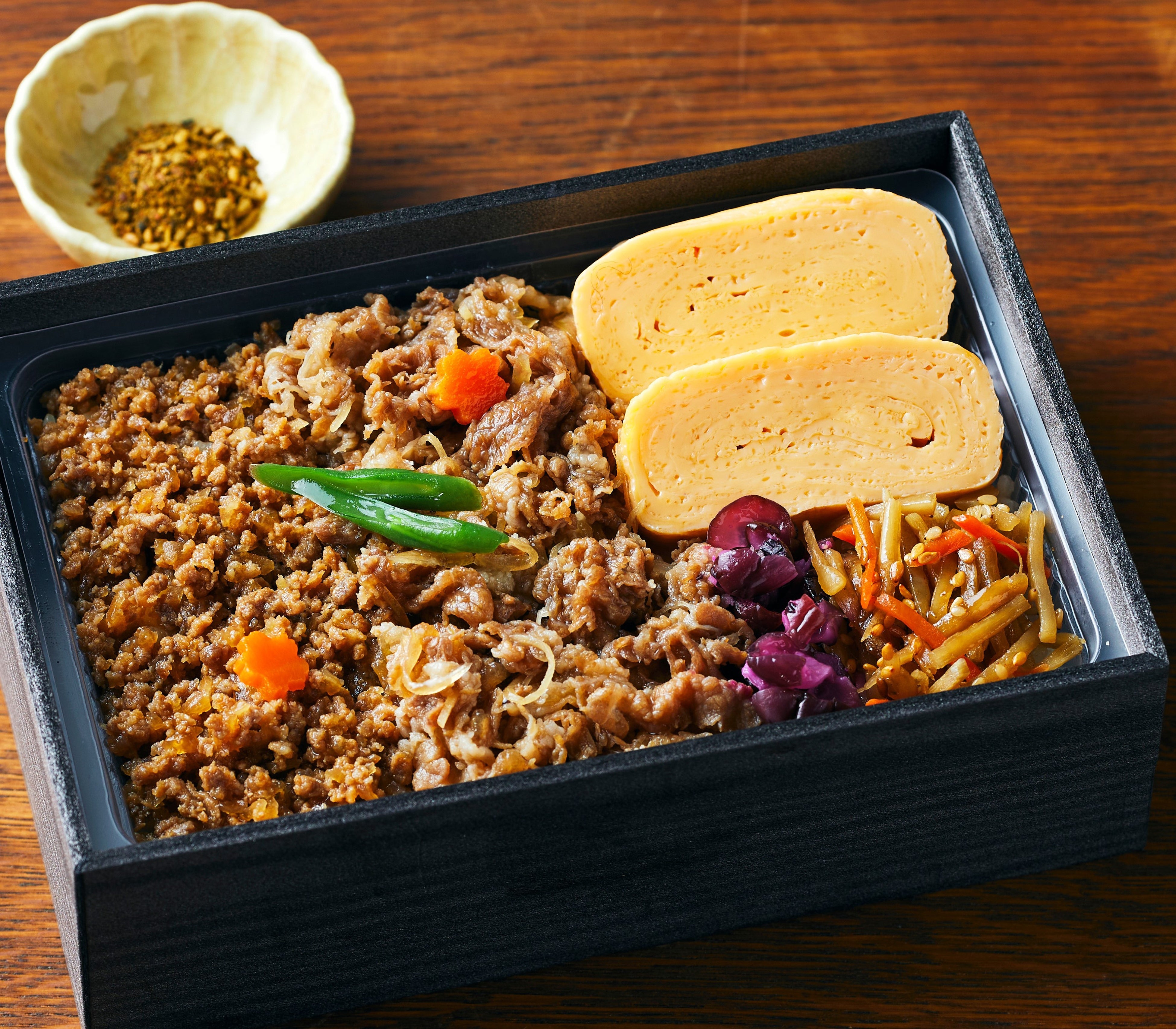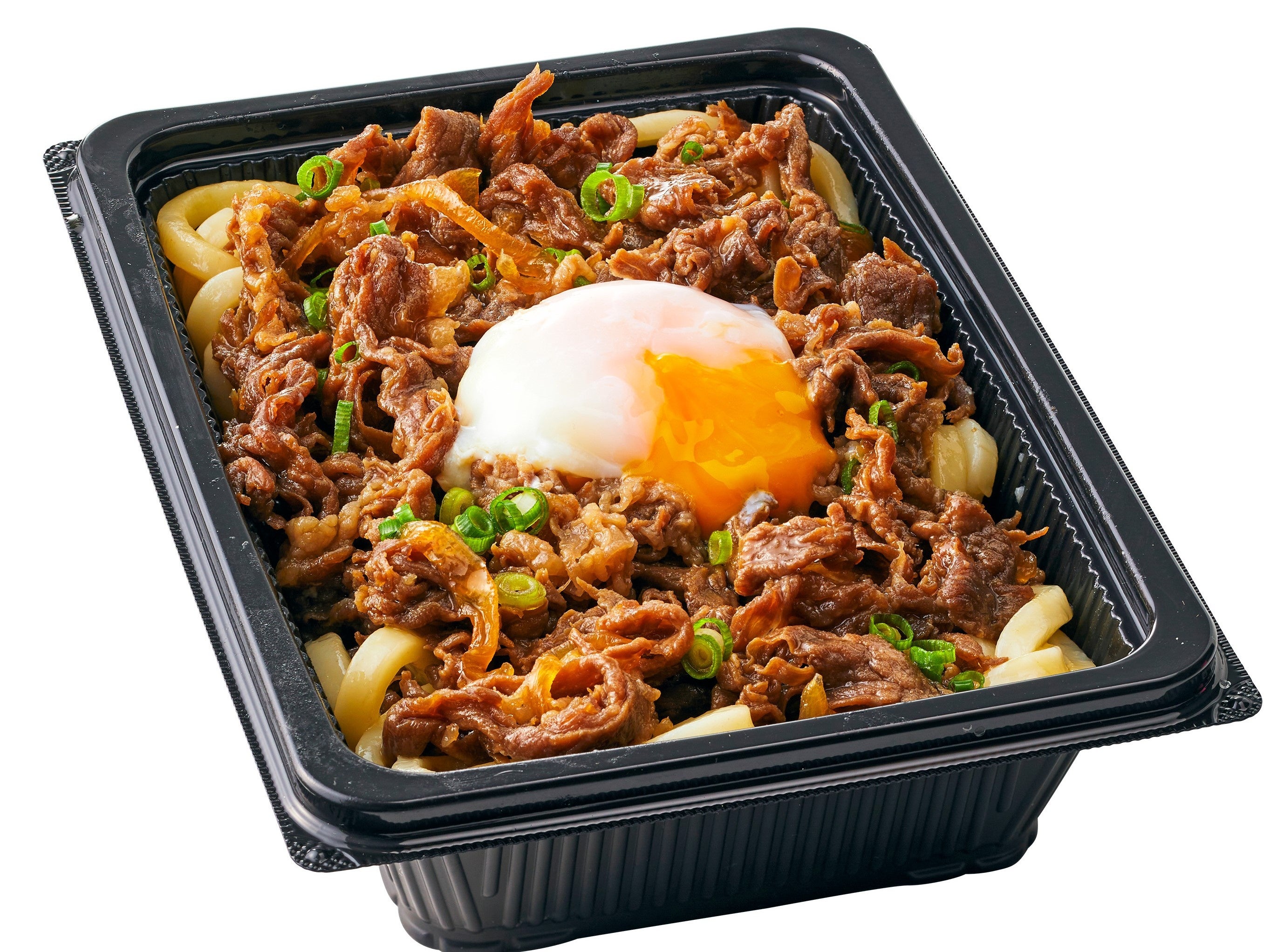 うどん弁当の牛肉を200%増量しました。甘辛い牛肉と温玉の相性が抜群です。