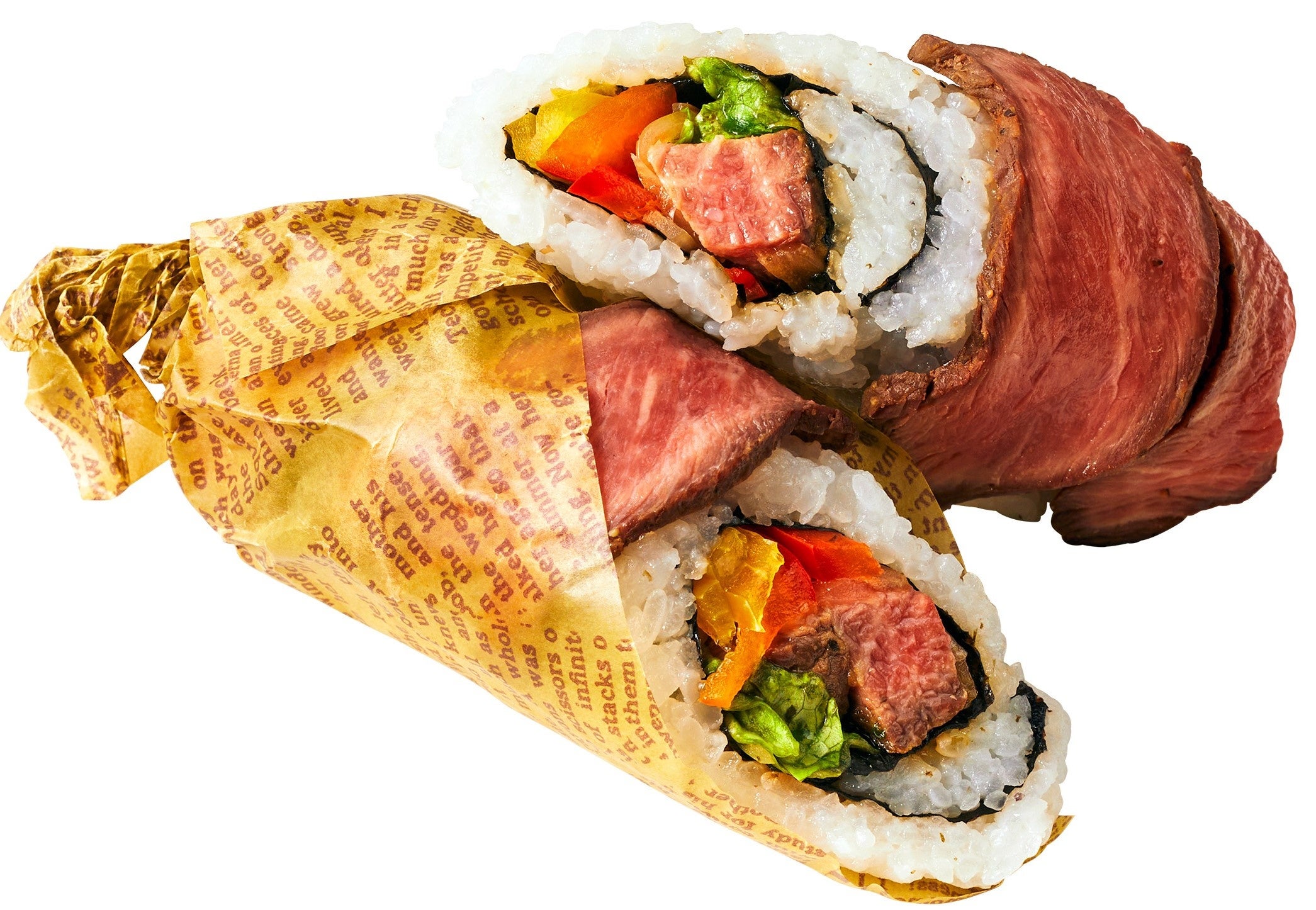 お肉と野菜たっぷりの巻き寿司に、さらにローストビーフを巻きました。