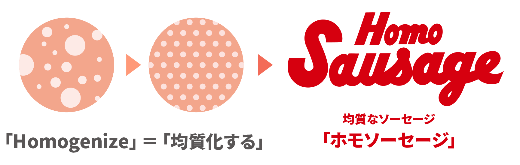 ホモソーセージの「ホモ」は、英単語の「Homogenize」(ホモジナイズ・均質化する)が由来です。