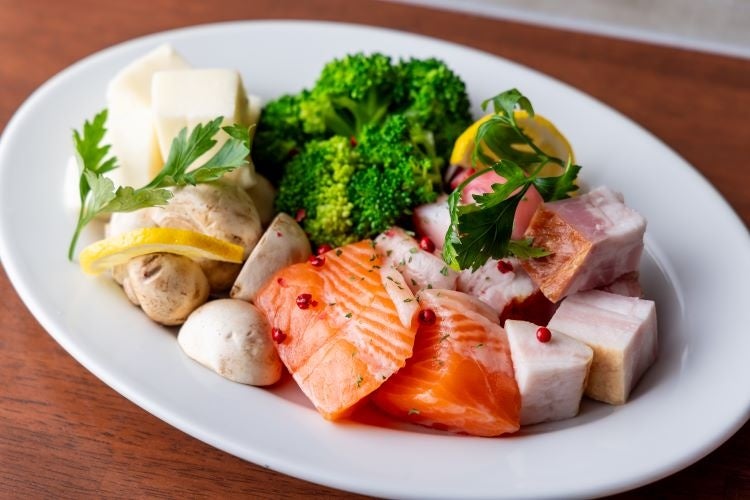 魚介類のマリネを中心に、キャロットラペ、ピクルス、野菜の塩煮込みをサラダと合わせて食べる一品。
