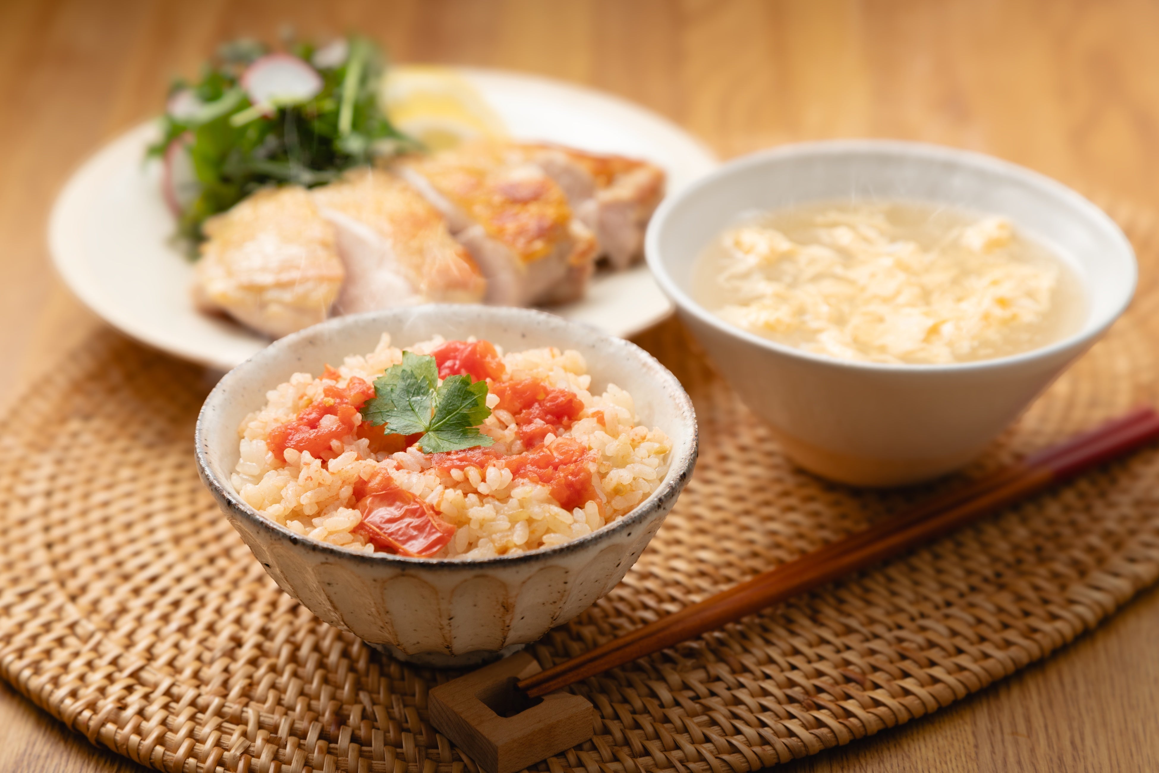 焼き魚やチキンステーキなど、おかずと合わせて楽しむだけでなく、おにぎりにして小腹を満たす一品にも。トマトのだし炊きご飯は、卵で包んだ和風オムライス風もおすすめです。