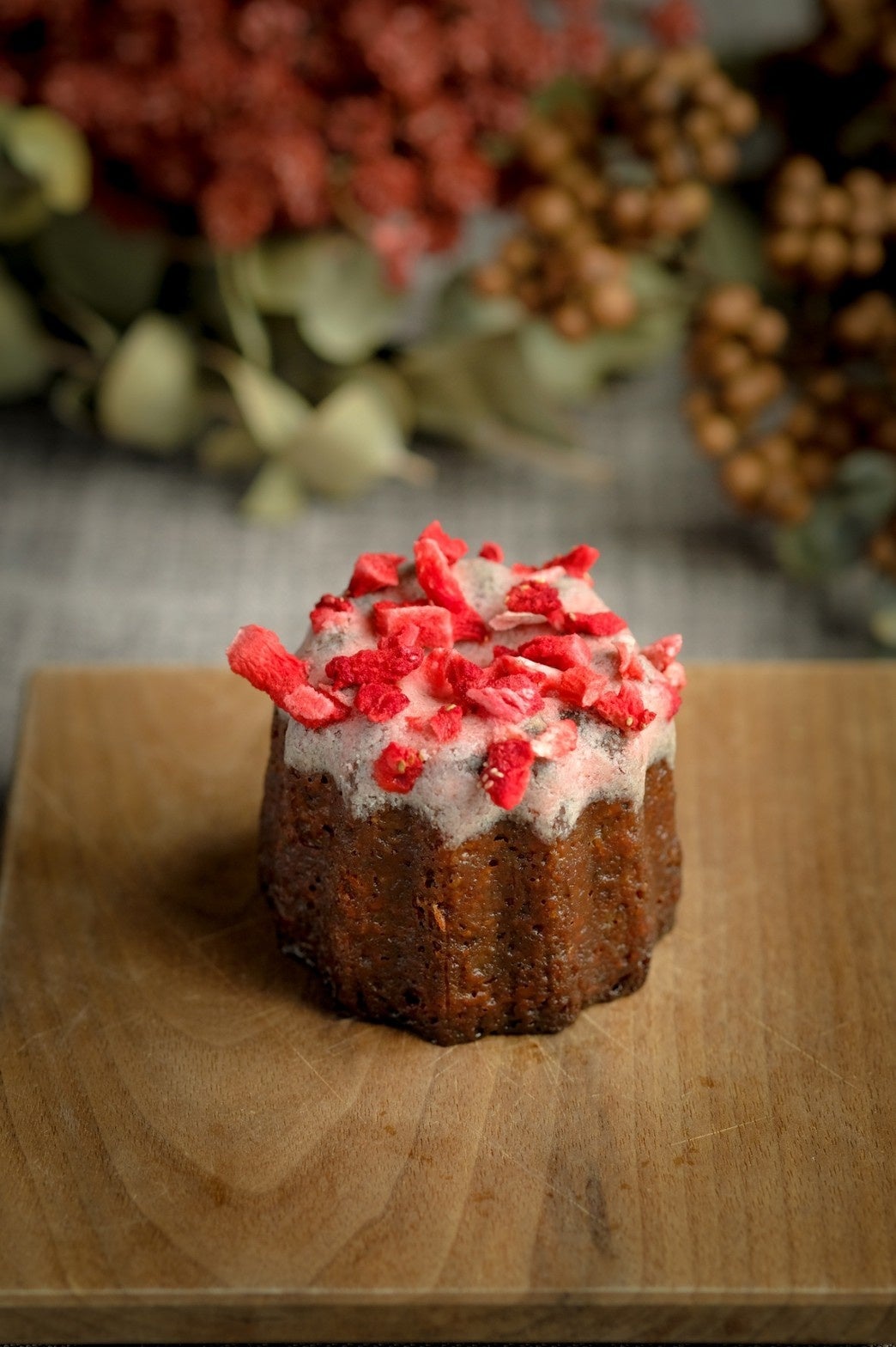 ・イチゴとアイリッシュウイスキー:アッサムの茶葉にアイリッシュウィスキーとカカオを少しブレンドさせたカヌレに、いちごのソースとフリーズドライしたいちごをトッピング。アイリッシュウィスキーの甘い香りが大人な香り、他では味わえない味わい。