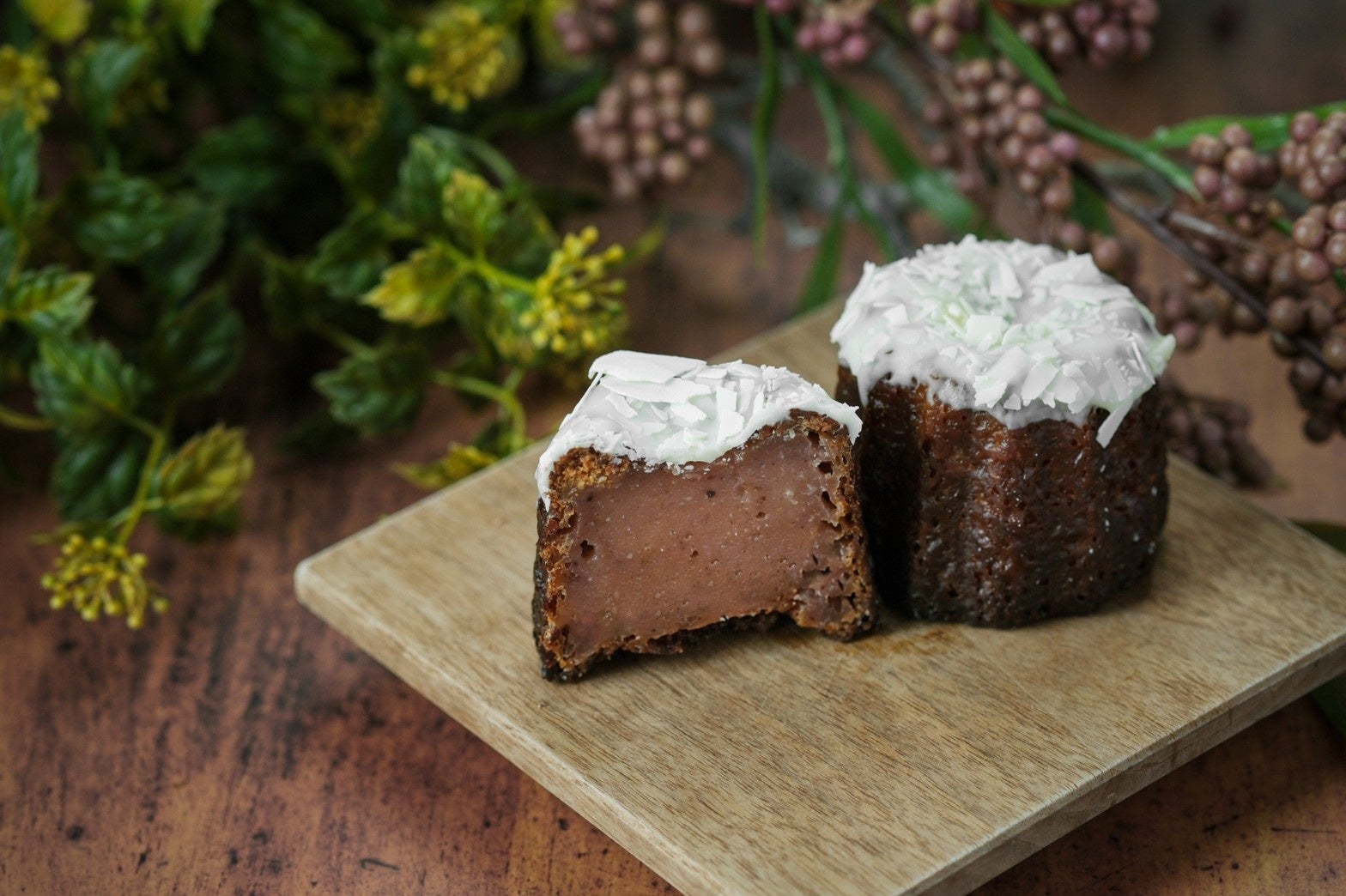 生地にココアを加えたチョコカヌレに、生チョコを中に入れました。クランチチョコをトッピングし、チョコ感たっぷりな濃厚生チョコカヌレです。
