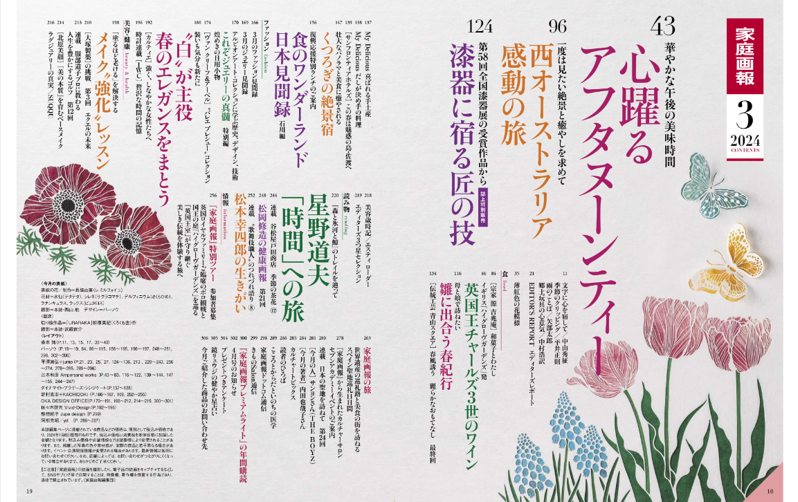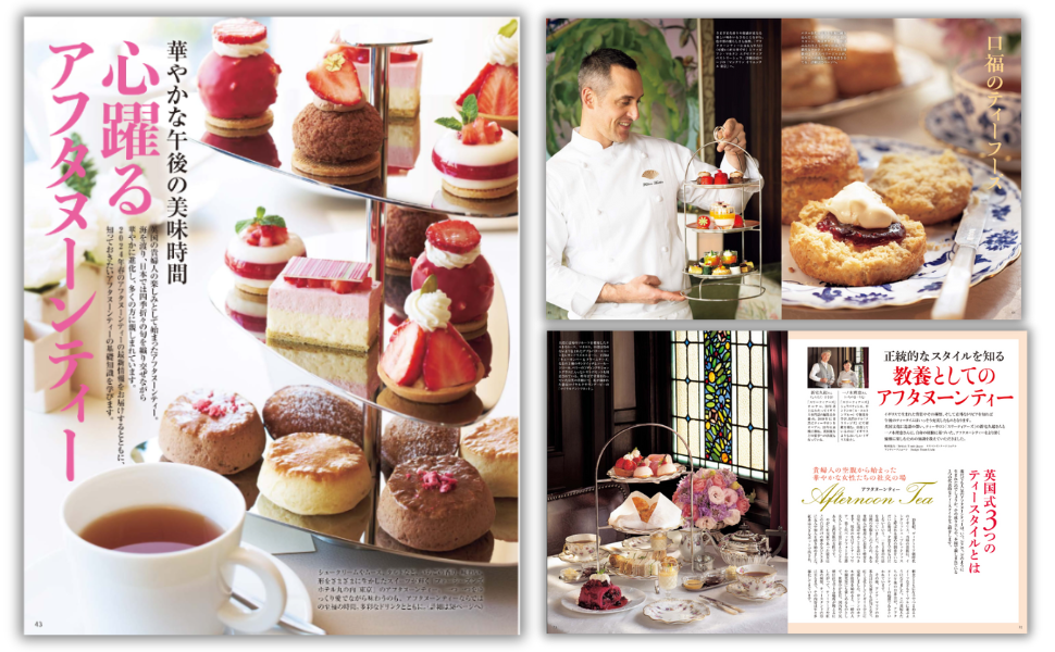 今、アフタヌーンティーを楽しむ活動を「ヌン活」と呼び、SNSなどで話題です。元来、英国の貴婦人の楽しみとして始まったアフタヌーンティー。本誌では、2024年春のアフタヌーンティーの最新情報をお届けするとともに、知っておきたいアフタヌーンティーの基礎知識も紹介。四季折々の旬を織り交ぜながら華やかに進化した、日本のアフタヌーンティーを特集します。