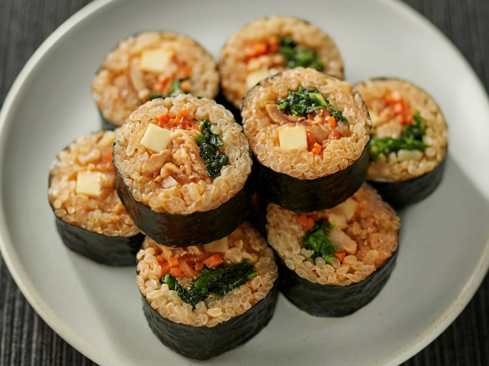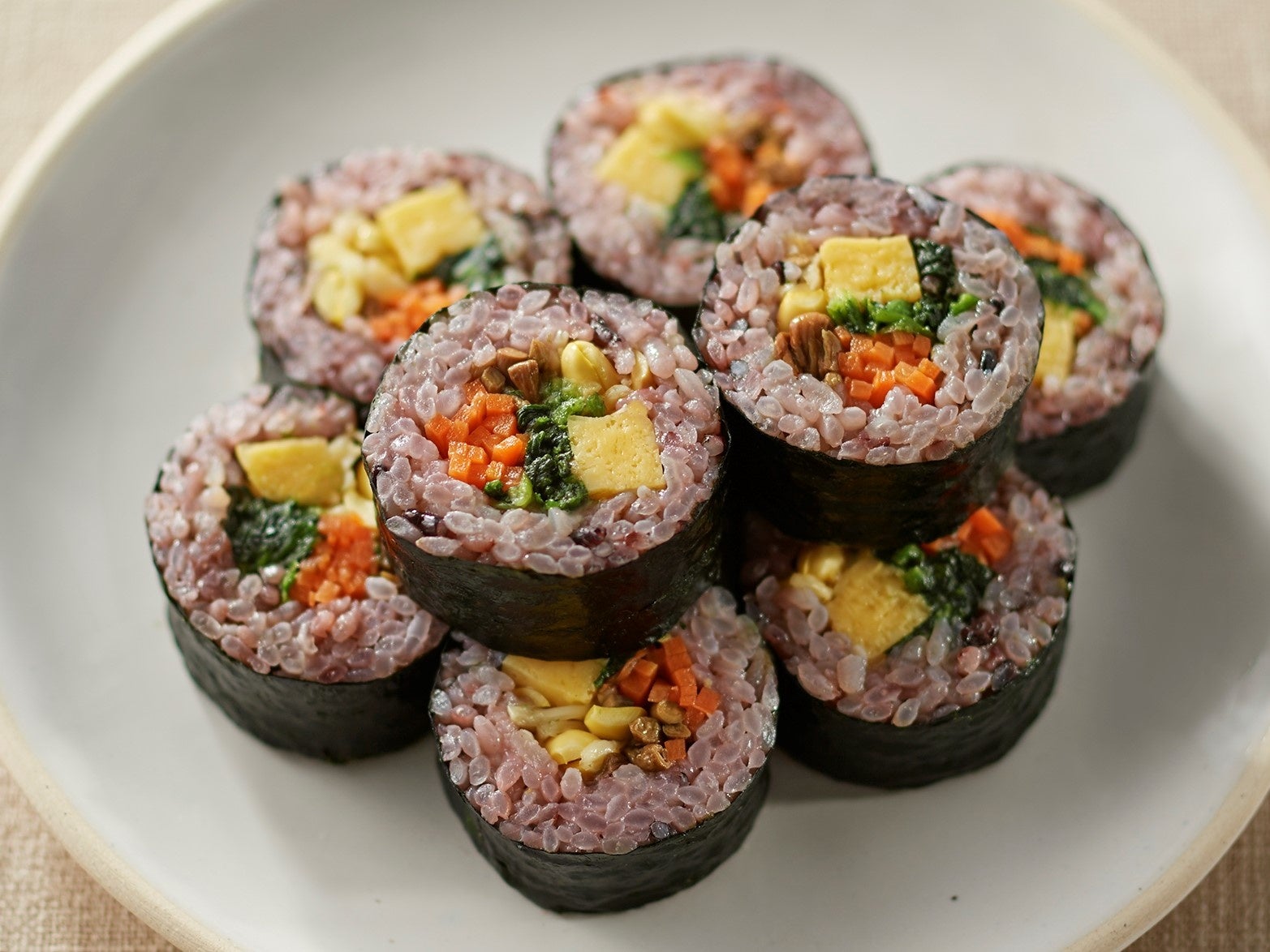 ほうれん草、もやし、にんじん、ぜんまいの4種類の野菜と玉子を巻いています。野菜がメインでありながら満足感を得られるように、ナムルはごま油の風味をきかせ、豆もやしで食感を出し、玉子で食べ応えを出しています。黒米入りのごはんを合わせ、プチプチした食感も楽しめます。