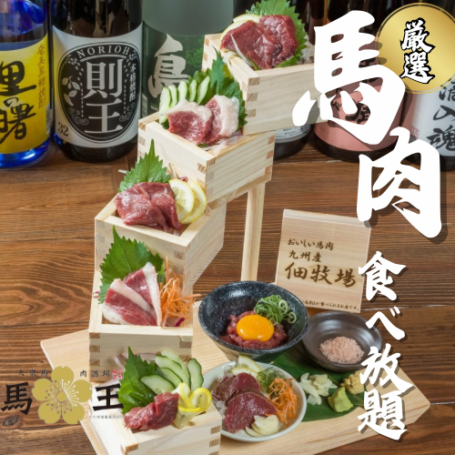 2024年2月2日(金)から3月31日(日)までの期間中「大衆馬肉酒場 馬王 十三店」で、自慢の馬刺し・創作馬肉料理が食べ放題となるプレミアムコースの提供を開始いたします。一日二組限定となりますので、お早めにご予約をお願いいたします。本プランでは鹿児島佃産・生馬刺し階段盛やローストビーフならぬ「ローストホース」や馬肉ハンバーグなど当店自慢の創作馬肉料理が全40品、食べ放題でお楽しみ頂けます。