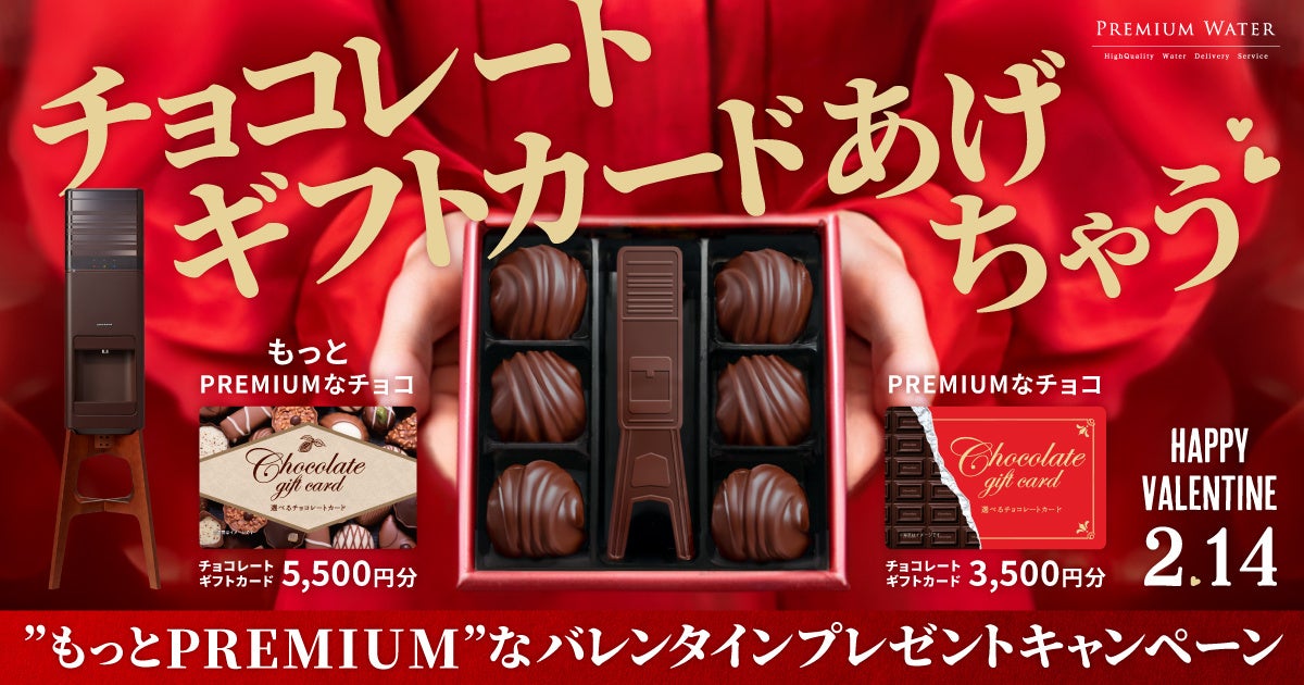 2月1日(木)~2月14日(水)のキャンペーン期間中、プレミアムウォーターご契約者様はメールマガジン内のURLよりお申込みいただくと抽選で25名様に「もっとPREMIUMなチョコ」として、「【伊藤忠食品ギフトカード】選べるチョコレートカード5,500円分」をプレゼントいたします。また、Xをご覧の方はプレミアムウォーター公式Xアカウントをフォローし、「#プレミアムウォーター」、「#もっとPREMIUMなバレンタイン」のハッシュタグをつけて対象の投稿を引用リポストいただくと、抽選で25名様に「PREMIUMなチョコ」として「【伊藤忠食品ギフトカード】選べるチョコレートカード3,500円分」をプレゼントいたします。