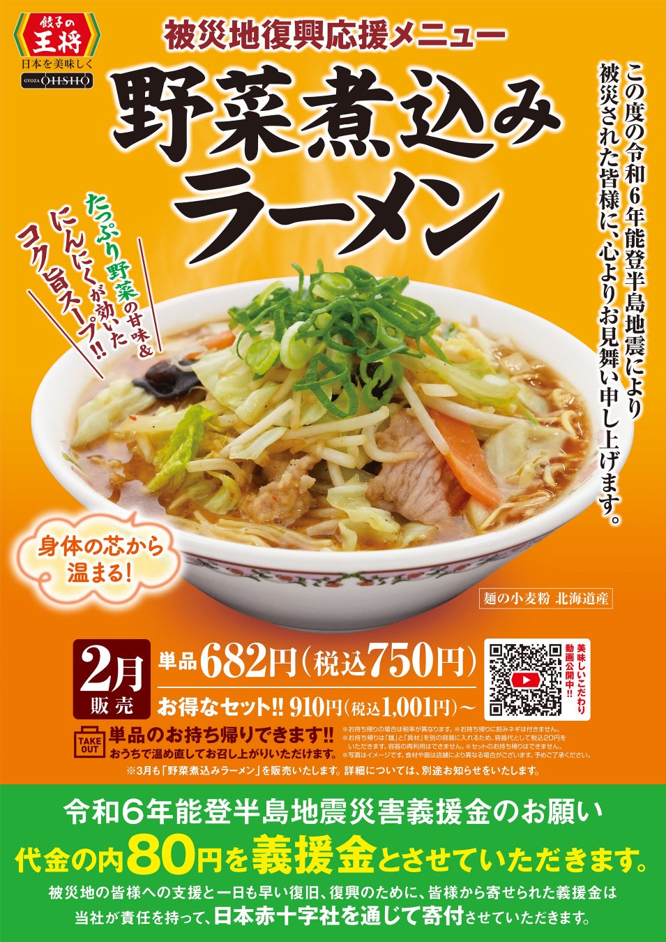 なお、「野菜煮込みラーメン」の2月の売上の一部(1杯につき80円)を、令和6年能登半島地震災害義援金として、日本赤十字社を通じて寄付させていただきます。