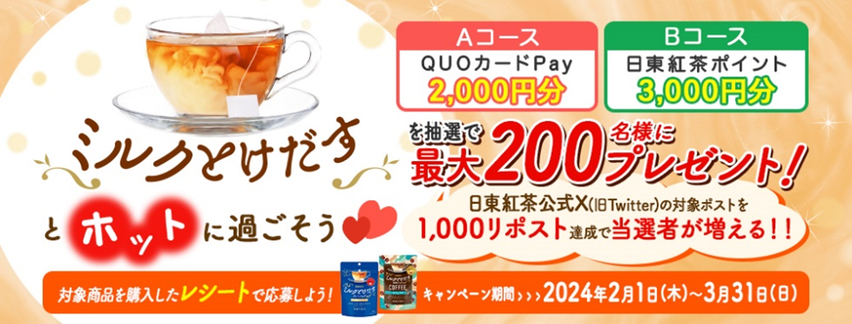 三井農林株式会社(所在地:東京都港区、代表取締役社長:佐伯 光則)では、2024年2月1日(木)~2024年3月31日(日)の間、日東紅茶の対象商品を購入したレシートで応募する「ミルクとけだすティーバッグとホットに過ごそう♡」キャンペーンを実施いたします。暦の上ではもうすぐ春ですが、寒さも残るこの季節、紅茶でホットに過ごしていただきたいという想いをこめてプレゼントキャンペーンを実施します。さらに今回も日東紅茶公式X(旧Twitter)と連動。規定数のリポスト達成で当選者が増える仕組みになっています。
