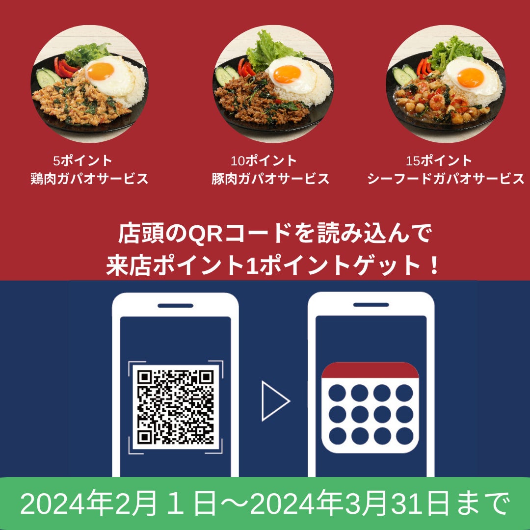 期間:2024年2月1日(木)~2024年3月31日(日) 内容:期間内にLINE来店ポイント(1来店1ポイント)をためていただくと5ポイントごとにガパオライスを無料で提供 ポイント 5ポイント 鶏肉ガパオ 10ポイント 豚肉ガパオ 15ポイント シーフードガパオ ※アレルギーがある方はスタッフまでお申し付けください |