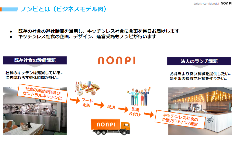 ケータリングでオフィスをコミュニティープレイスに変える「nonpi Chef’s LUNCH」、オンライン懇親会向けに料理と飲み物を全国配送し距離の制約を超えたコミュニケーションを実現するフードデリバリー「nonpi foodbox®」をはじめ複数の事業を展開しています。