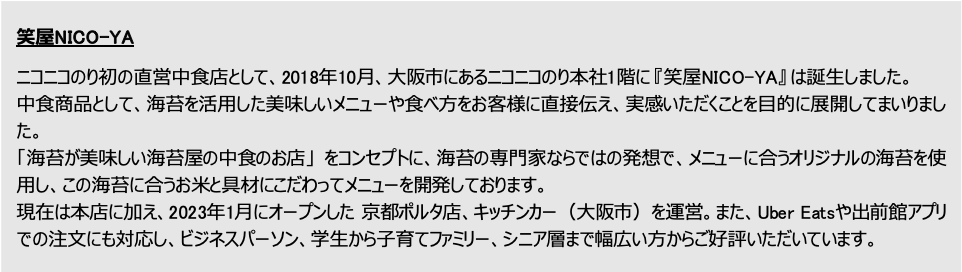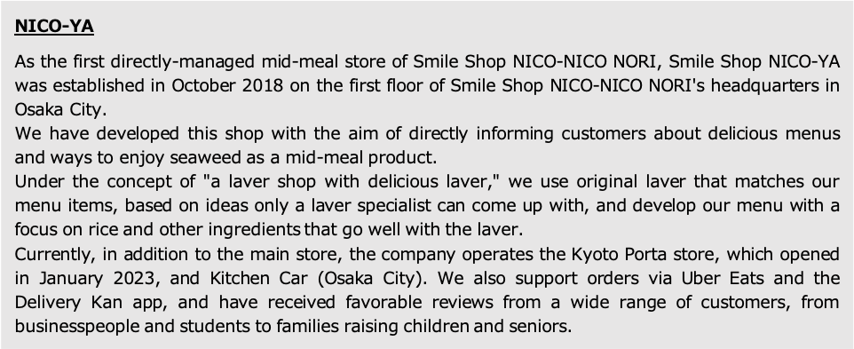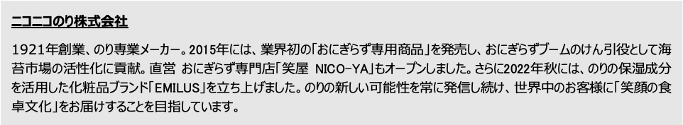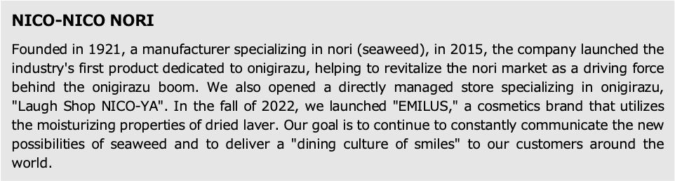 (Head office: Osaka City, Osaka; President: Kiyomasa Shiraha), a manufacturer specializing in laver since 1921, has been offering safe and high-quality laver products and processed foods that are ahead of their time to bring smiles to dining tables and families. Since the industry-academia collaboration agreement signed in October 2022 with Tsukamoto Gakuin Osaka University of Arts, the company has continued the “Onigiri of the World” project. The “Onigiri of the World” is a project that aims to increase the number of people who will have the opportunity to experience the food culture of countries around the world and to promote their country’s menu to people in other countries through onigiri that make use of the characteristics of food and ingredients from around the world, developed by utilizing the creativity and ideas of students and the product development capabilities of NICO-NICO NORI for the 2025 Osaka/Kansai World Exposition. We hope that the increased opportunities to eat onigiri will lead to more exchanges between people from different countries.
