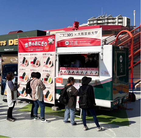 In cooperation with Osaka University of Arts, we have so far commercialized 20 kinds of onigiri from 13 countries (*1) and have sold them at various events with students from Osaka University of Arts at the NICO-YA (*2) kitchen car. (*3)