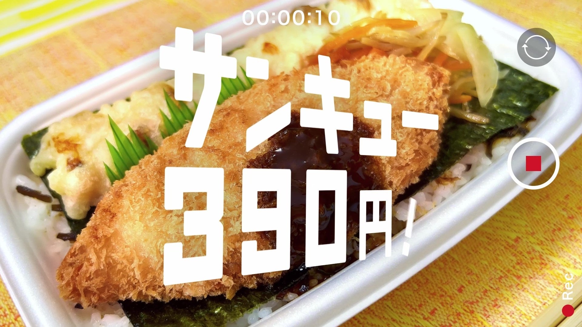 友人同士の賑やかな食事シーンの中で『のり弁当』の魅力を訴求しています。蓋を開けた瞬間、のり弁当に思わずテンションが上がってしまう場面から始まり、白身魚のフライやちくわの天ぷらの美味しさを賑やかな会話やテロップで紹介していきます。のり弁当のお値打ち感を「サンキュー390円!」というフレーズで締めくくりました。