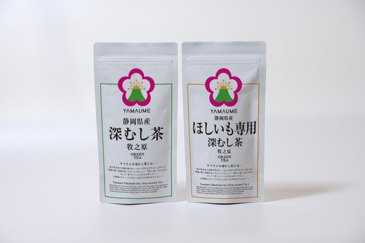 牧之原台地で太陽の恵みをいっぱいに受け土作りからこだわり、茶葉の蒸し時間を通常よりも長くすることで美味しく仕上げた深むし茶です。今回「うぐいす(緑茶)」と、ほしいもに合うように味・香りを整えた「ほしいも専用(緑茶)」をご用意しました。