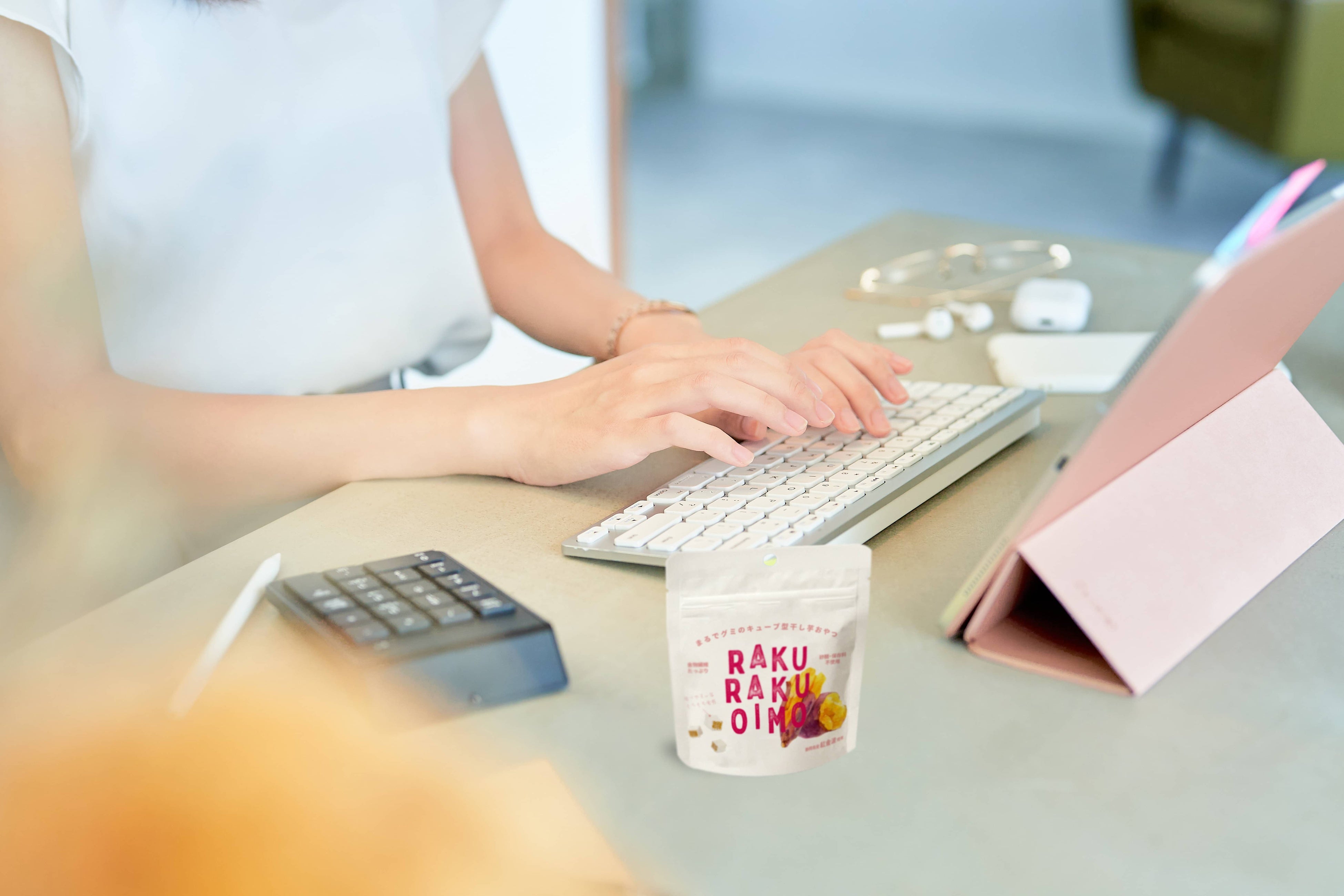 RAKURAKU OIMOは小粒のキューブタイプで持ち歩けるパッケージ。「手軽に」「どこにでも持ち歩きたくなる」罪悪感なし(ギルトフリー)のお芋のおやつです。