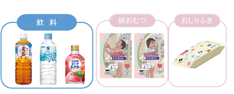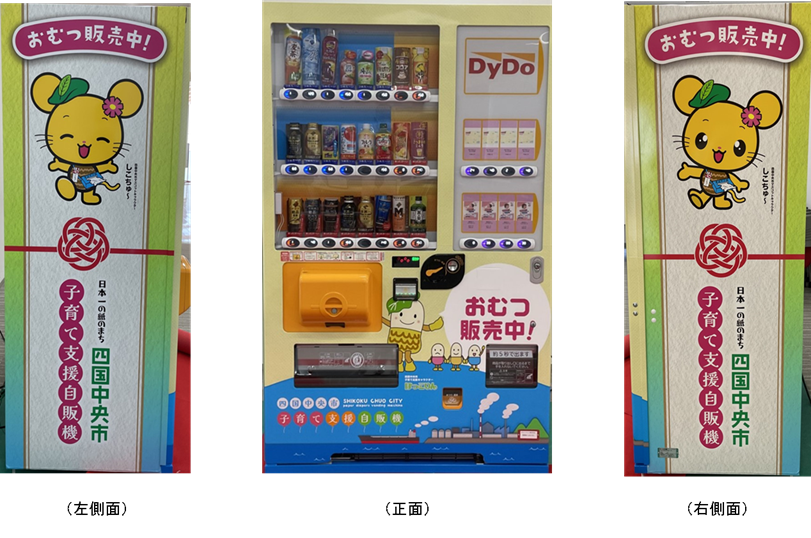 本自販機は、売上げの一部を社会福祉法人四国中央市社会福祉協議会を通じて、市内の子ども食堂等の支援・拡充に役立てられます。また、子育て世代の方々が紙おむつの心配をすることなく外出できるよう、飲料とともにベビー用 紙おむつ(ベビー用 紙おむつの小パック (2枚入り))やおしりふきが購入できる自販機となっています。さらにラッピングは、オリジナルデザインを採用。購入時には、市内在住のお子様の可愛い声で子ども食堂をPRするなど子育て支援を全面に訴求したオリジナルな自販機です。