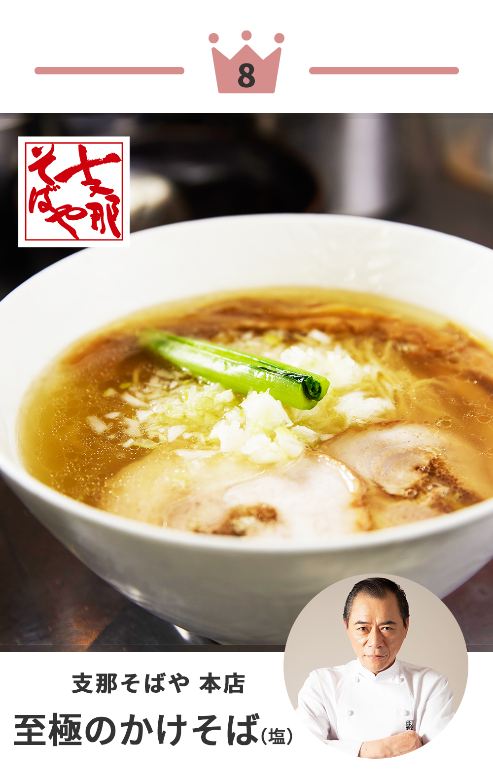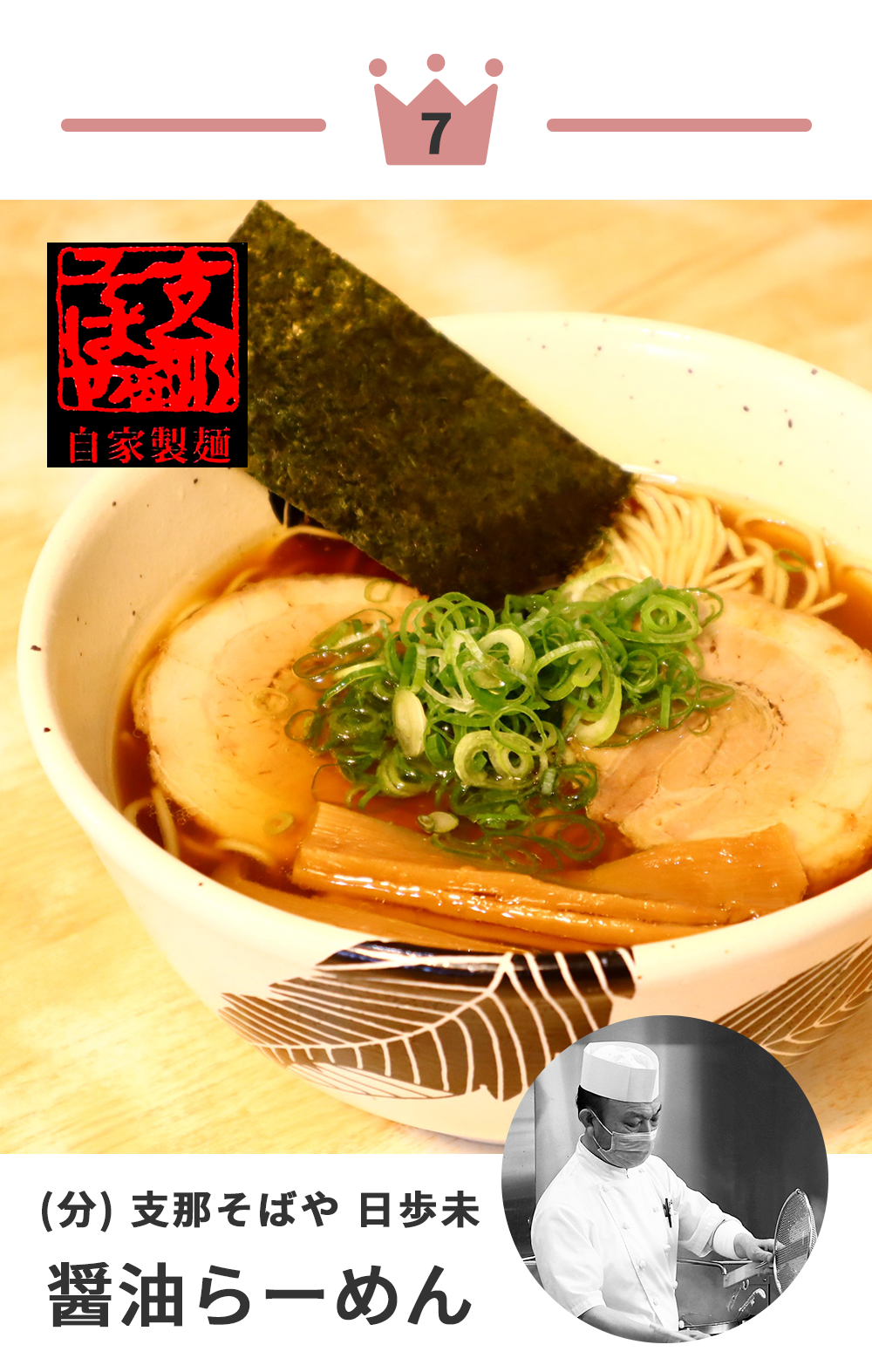 琥珀に透き通った清湯醤油スープからは、想像の遥か上を行く奥深い旨味と研ぎ澄まされた素材の調和を感じる。そのスープをしっかりと引き上げる中細ストレート麺は、極めてしなやかでいて小麦の風味がふわッと香り、いつまでも啜り続けていたいと思える程の至極の一杯。「さすがの一杯!」という絶賛の声も多い、年間ランキング第2 位のラーメンです。