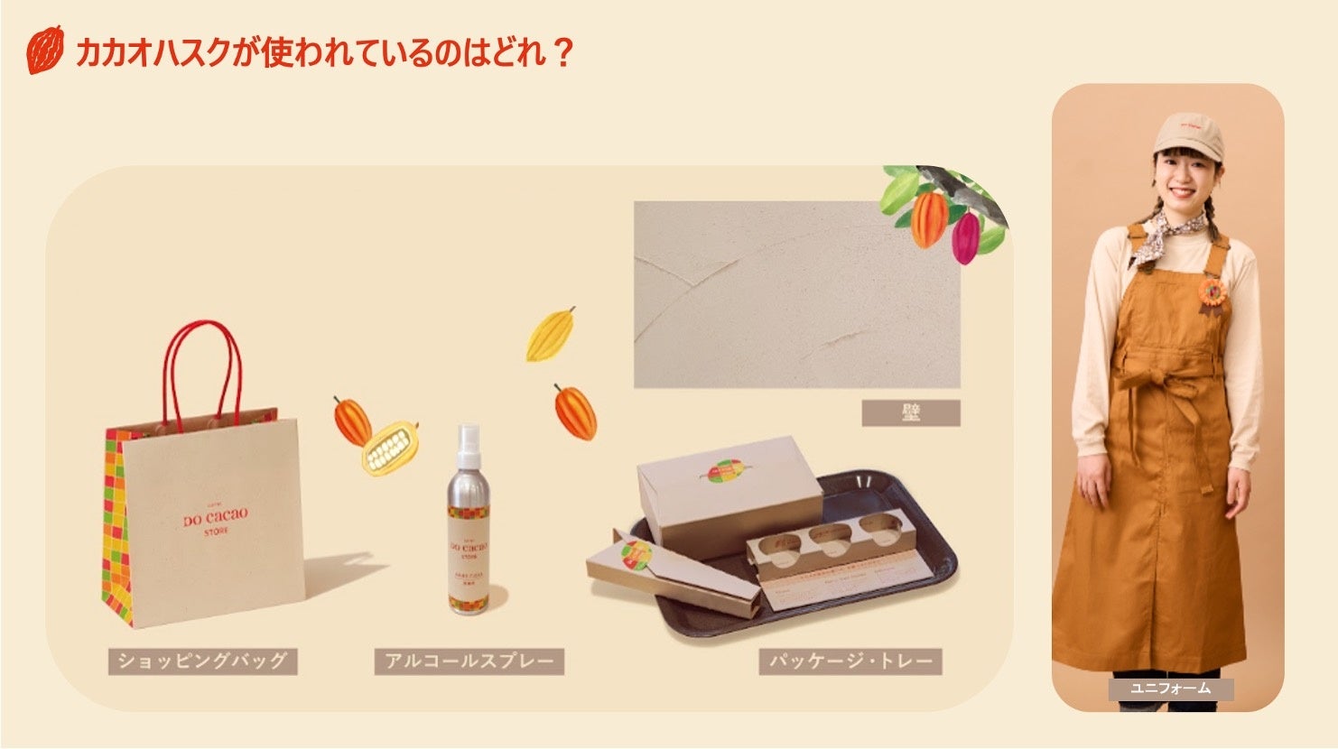 サステナブルなカカオの取り組みを学ぶクイズ。ディスプレイテーブルに並ぶもの(アルコールスプレーやスタッフ着用のユニフォームなど)を見て、どれがカカオからできているものかを当てていただきます。