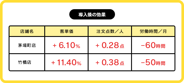 また、導入前の課題となっていた人件費に関しては、茅場町店では60時間/月、竹橋店では50時間/月の削減に繋がりました。
