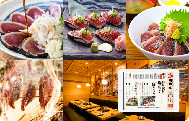 明神丸は、鰹の藁焼きを天日塩で食べる本場土佐流の食べ方にこだわり、全国にその食べ方を広めた「元祖 藁焼き鰹塩たたき」発祥の藁焼き鰹たたき明神丸を全国12店舗に直営飲食事業として展開しています。
