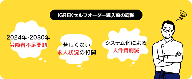 明神丸様では「人手不足への対応」と「人件費削減」をIGREKセルフオーダー導入前の課題とされており、飲食業界の慢性的な問題となっている、芳しくない求人状況の打開、システム化による人件費削減にご期待いただきました。