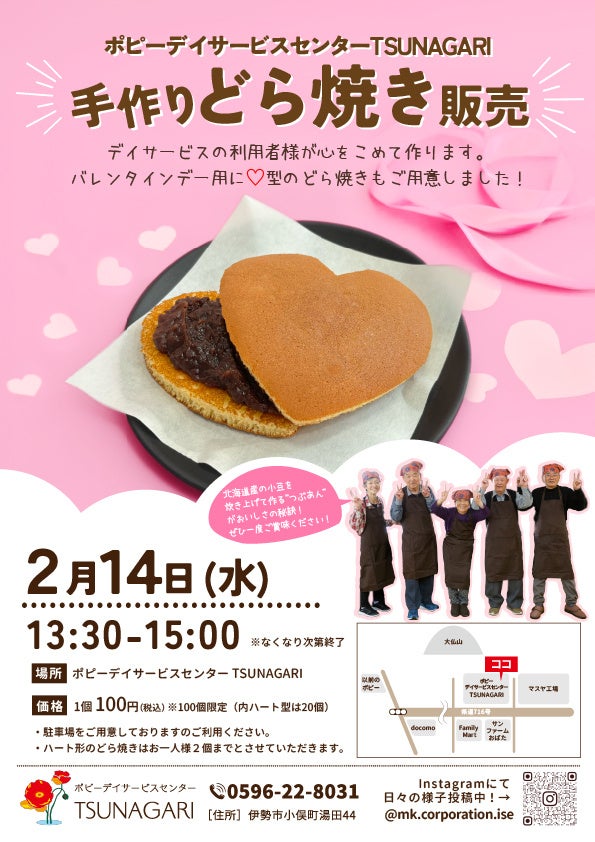 販売日時:2024年2月14日(水)13:30~15:00 販売場所:ポピーデイサービスセンターTSUNAGARI(三重県伊勢市小俣町湯田44)