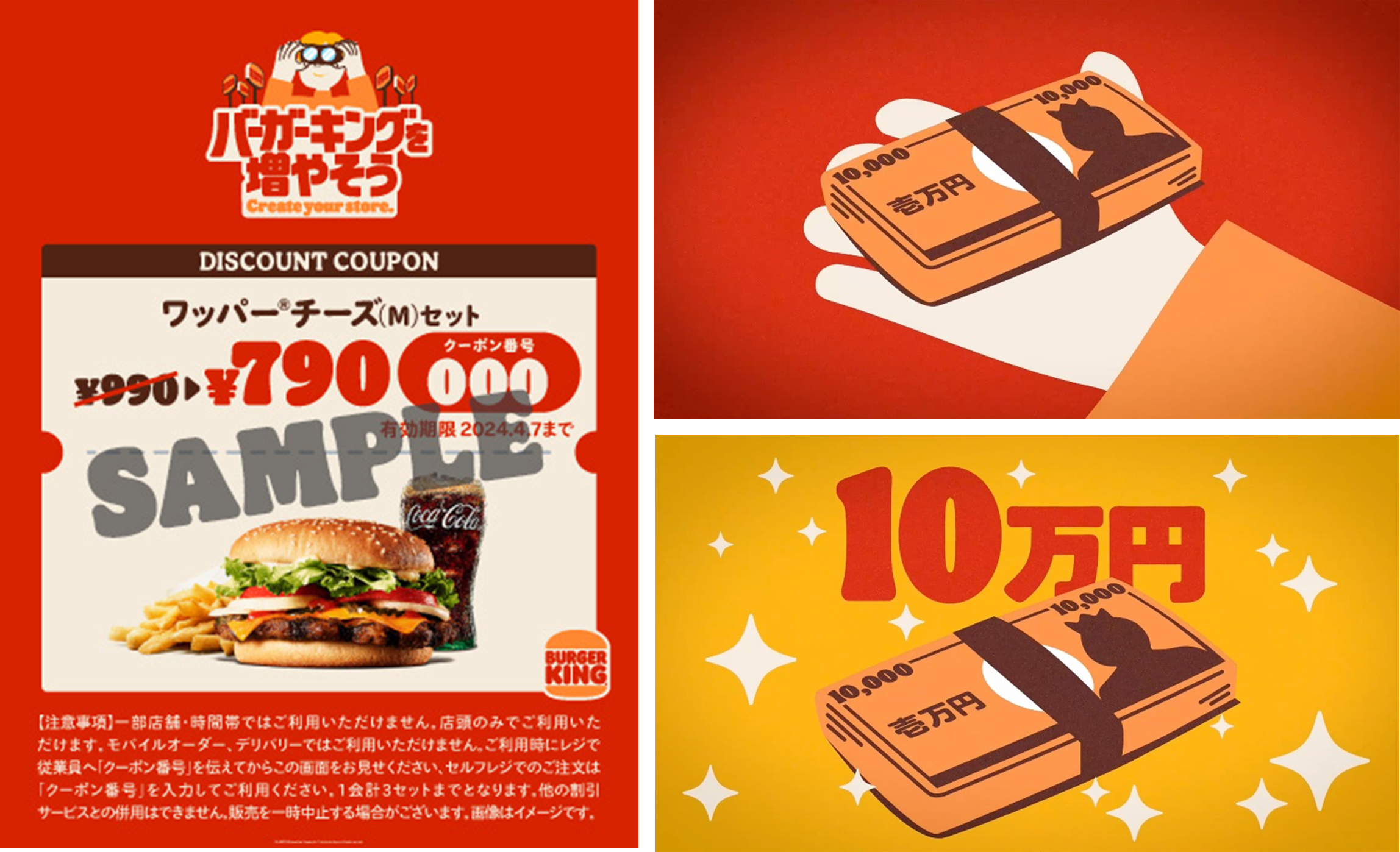 バーガーキング® のお店が近くになく出店を待ち望んでいただいている皆様も、いつもご愛顧いただいているファンの皆様も、ぜひバーガーキング® 公式HP特設WEBサイトの応募フォームに必要事項を記入の上、ご応募ください。見事、ご紹介いただいた物件が成約した場合には、10万円を差し上げます。また、ご応募いただいた方全員に、バーガーキング® 自慢の直火焼きの100%ビーフパティを使用した人気No.1メニュー『ワッパー® チーズ』セットが、通常価格990円のところ200円引きの790円で楽しめるお得なクーポンをもれなくプレゼントいたします。